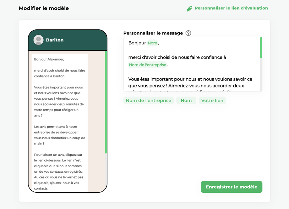 Le lien d’évaluation est l’élément central de votre stratégie de collecte d’avis avec Bariton.